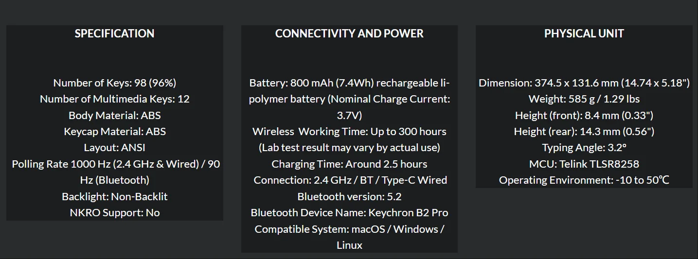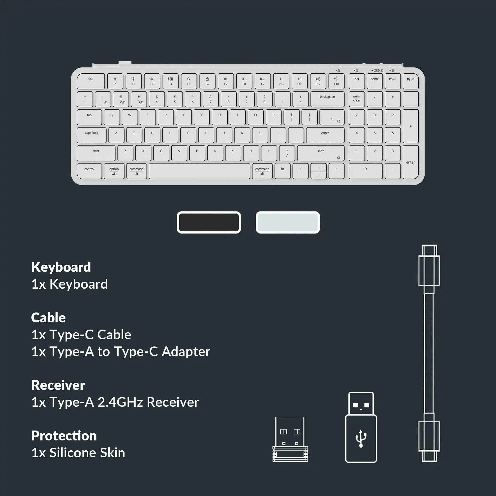The B2 Pro is an ultra-portable, lightweight wireless keyboard that supports 2.4GHz, Bluetooth, and wired modes. With ZMK customization, you can connect your phone, tablet, PC, and Mac simultaneously using three Bluetooth connections and one dedicated 2.4GHz dongle.