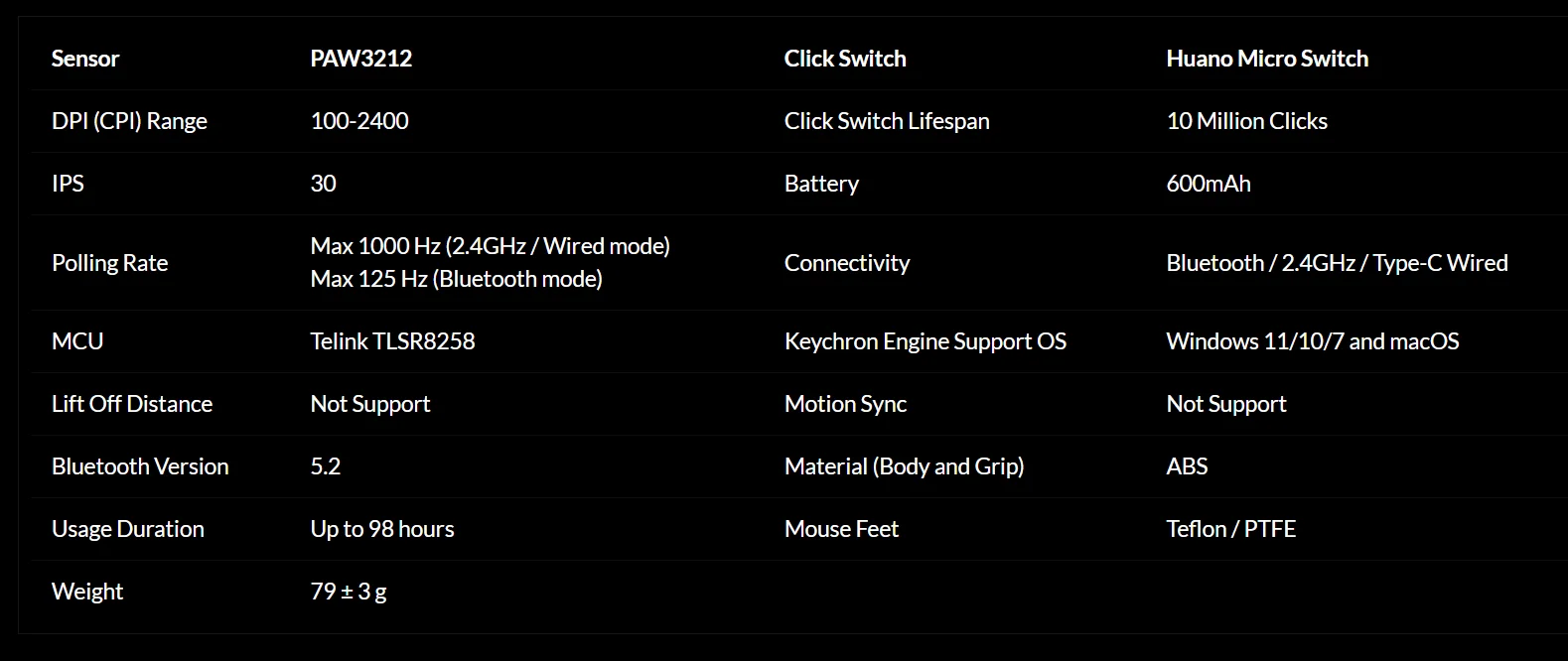 Keychron BM25 packs impressive features into a lightweight body at only 79g. Featuring the All Silent Micro Switch, it delivers an ultra-quiet, smooth clicking experience—perfect for shared spaces or late-night use. It supports 2.4 GHz, Bluetooth 5.2, and wired connections, making it ideal for work or on the go while ensuring reliable performance to maximize productivity.