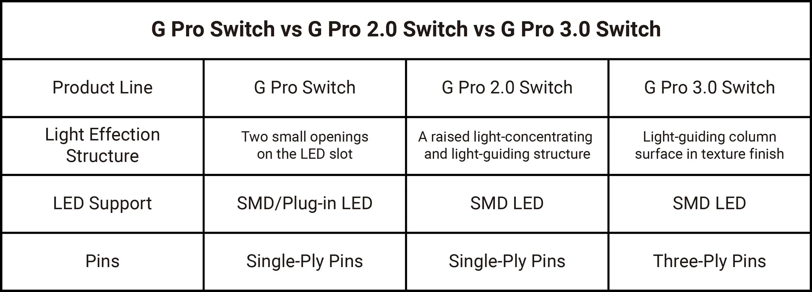 Compared to the G Pro 2.0 switch, the G Pro 3.0 is engineered with a frosted light-guided surface to enhance the light consistency and brightness.