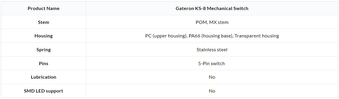 Gateron KS-8 Mechanical Switch is a Gateron conventional mechanical switch that brings noticeable improvements over the original MX switches. Enhancements have been made to create a smooth and natural typing experience. It is also perfectly compatible with 3mm round lights and plug-in full-color LED lights.