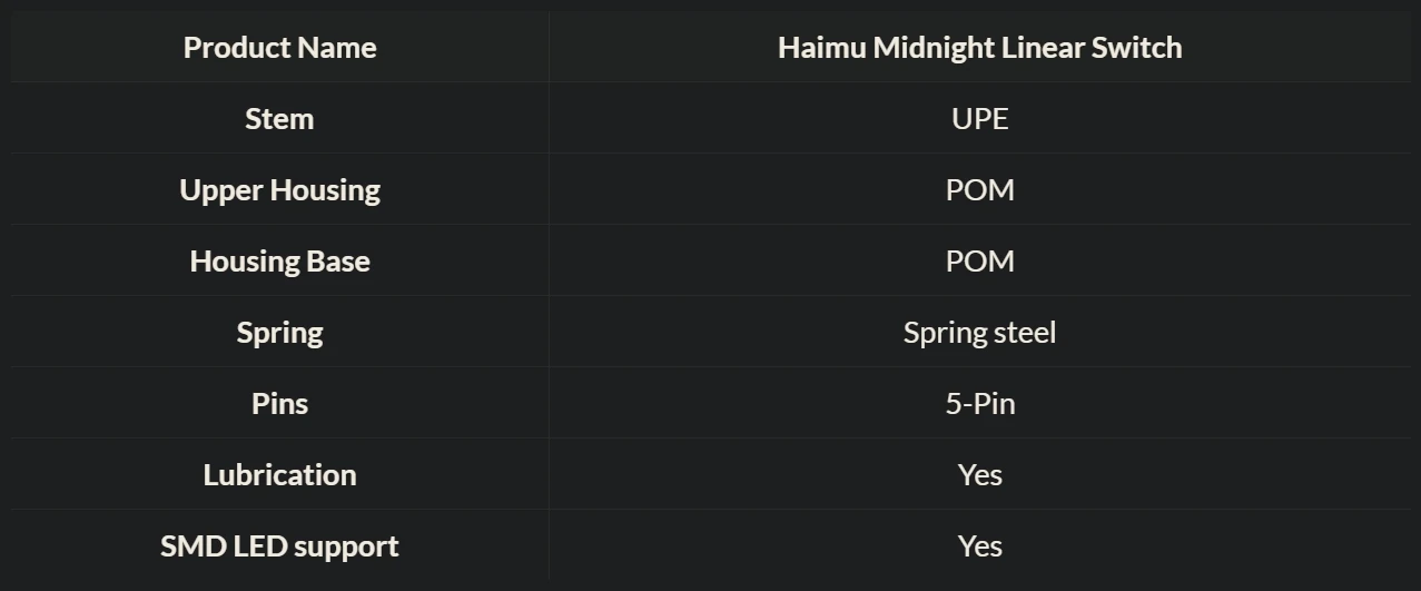 The Haimu Midnight Linear Switch is a premium mechanical switch designed for enthusiasts who demand both performance and durability. With its thoughtfully selected materials and innovative engineering, this switch delivers an exceptional typing experience that caters to gamers, programmers and everyday users alike.