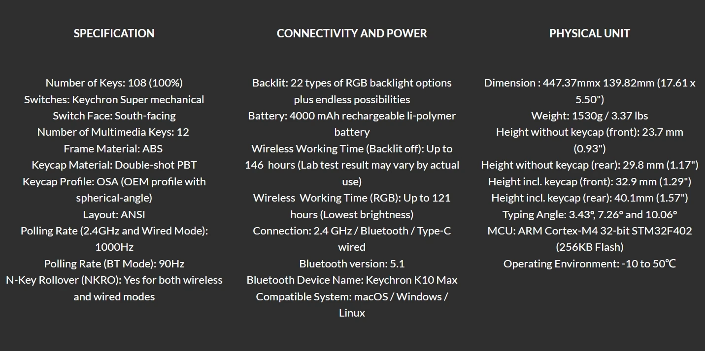 The K10 Max is a wireless mechanical keyboard with a 100% layout. It supports 2.4 GHz, Bluetooth, and wired connections. Configurable through QMK and Keychron Launcher web app, it offers endless possibilities and enhanced productivity in your work and gaming!