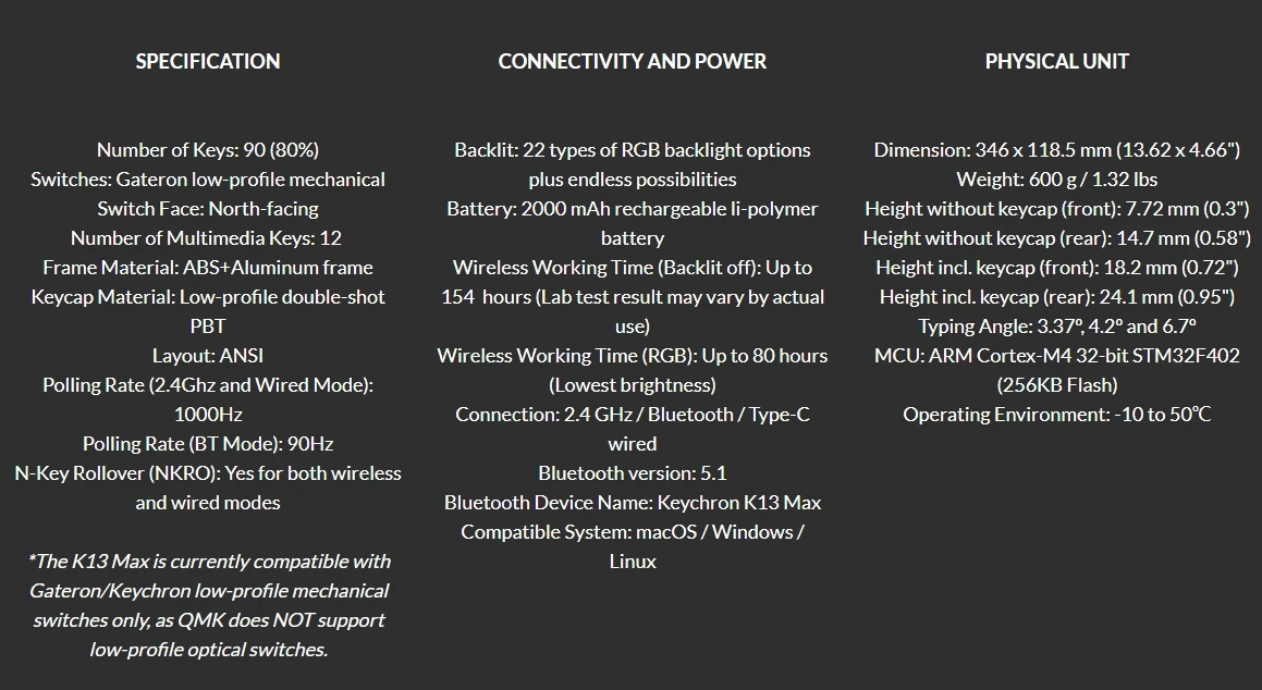 The K13 Max is a low-profile wireless mechanical keyboard featuring a unique 80% layout with a numpad. It supports 2.4 GHz, Bluetooth, and wired connections. Empowered by QMK/VIA, it offers endless possibilities and enhanced productivity in your work and gaming!