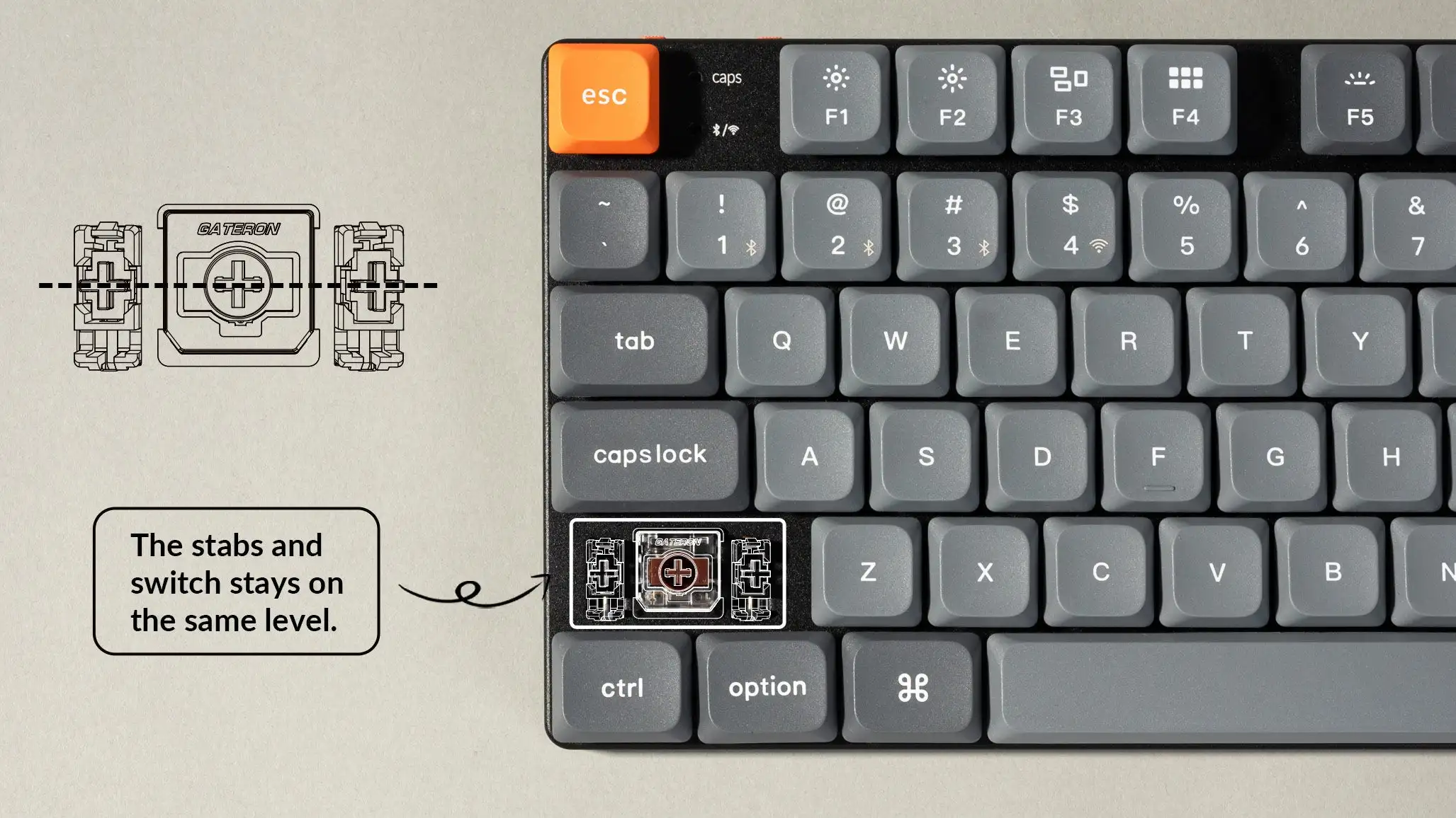 We've redesigned the stabilizers to make it stay on the level the same way as the switch while making sure it still delivers reliability and less wobble on the big keys like the space bar, left Shift, backspace, and Enter key.