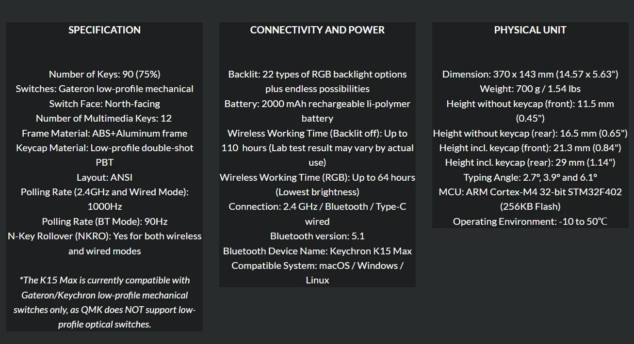*The K15 Max is currently compatible with Gateron/Keychron low-profile mechanical switches only, as QMK does NOT support low-profile optical switches.