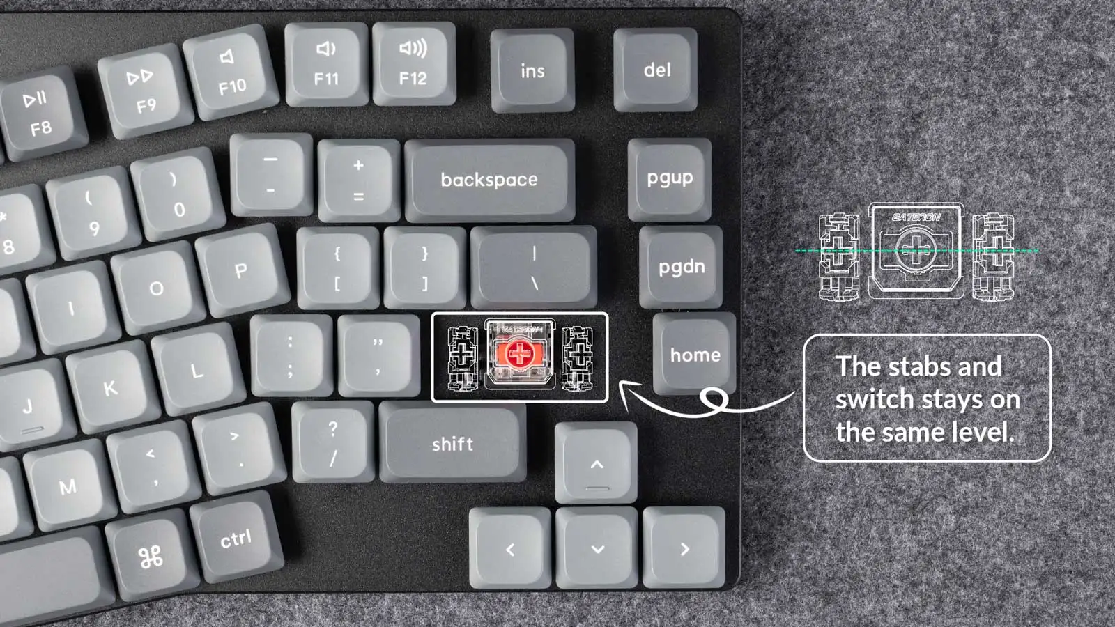 We’ve redesigned the stabilizers to make it stay on the level the same way as the switch while making sure it still delivers reliability and less wobble on the big keys like the space bar, left Shift, backspace, and Enter key.