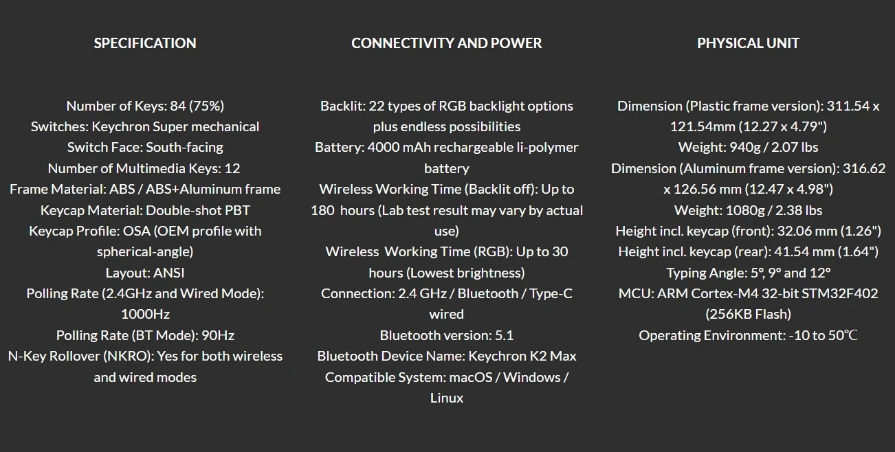 To further fine-tune your typing experience, the K2 Max comes with our unique OSA profile (OEM profile with spherical-angle) and double-shot PBT keycaps that aim to provide a more comfortable fingertip feel with excellent oil resistance for long-term use on the 75% layout.