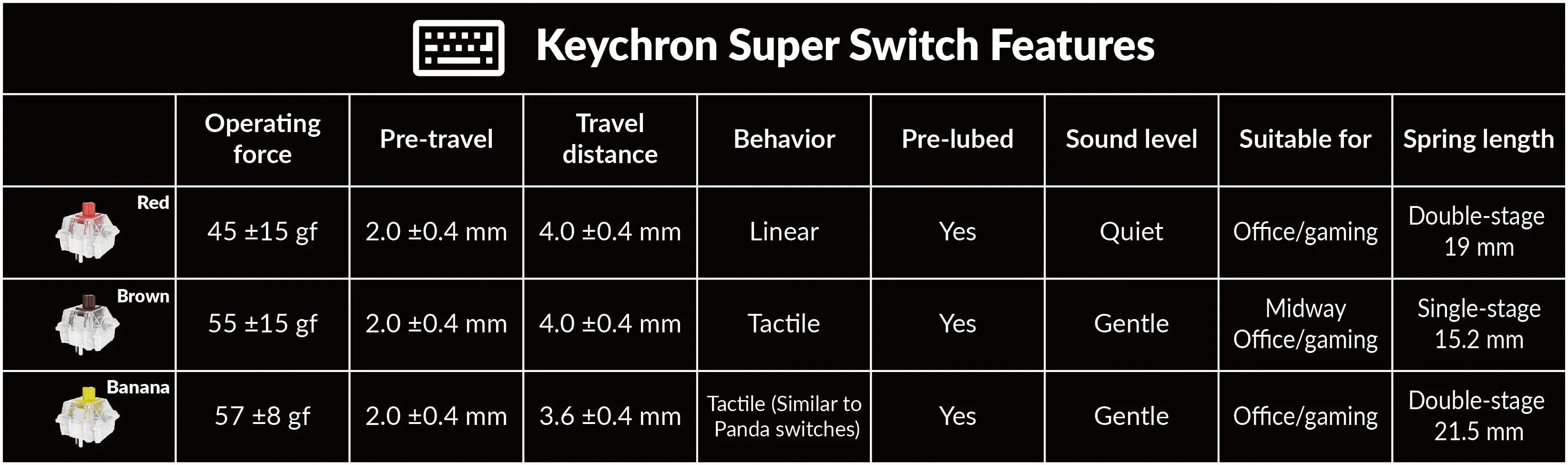 The Keychron Super Switch is built to last with a lifespan of 50 million clicks and provides great reliability and high performance for fast typing and competitive gaming. It offers red, brown, and banana options to match different users' preferences. Every switch is tested for pro-grade quality.