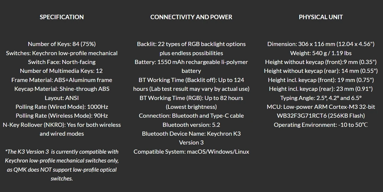 *The K3 Version 3 is currently compatible with Gateron/Keychron low-profile 2.0 mechanical switches only, as QMK does NOT support low-profile optical switches.