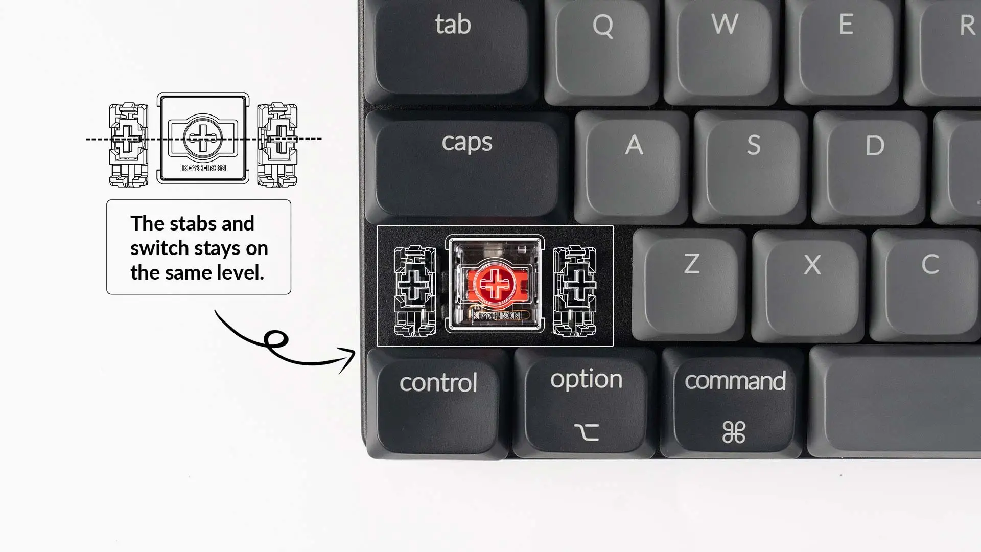 We've redesigned the stabilizers to make it stay on the level the same way as the switch while making sure it still delivers reliability and less wobble on the big keys like the space bar, left Shift, backspace and Enter key.