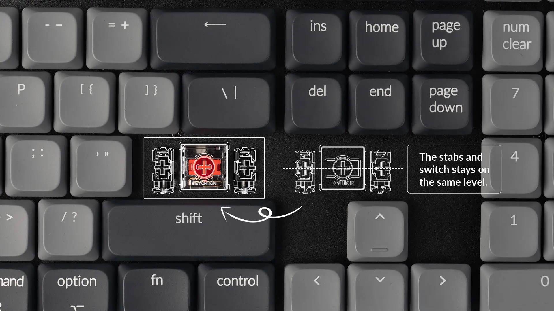 We've redesigned the stabilizers to make it stay on the level the same way as the switch while making sure it still delivers reliability and less wobble on the big keys like the space bar, left Shift, backspace and Enter key.