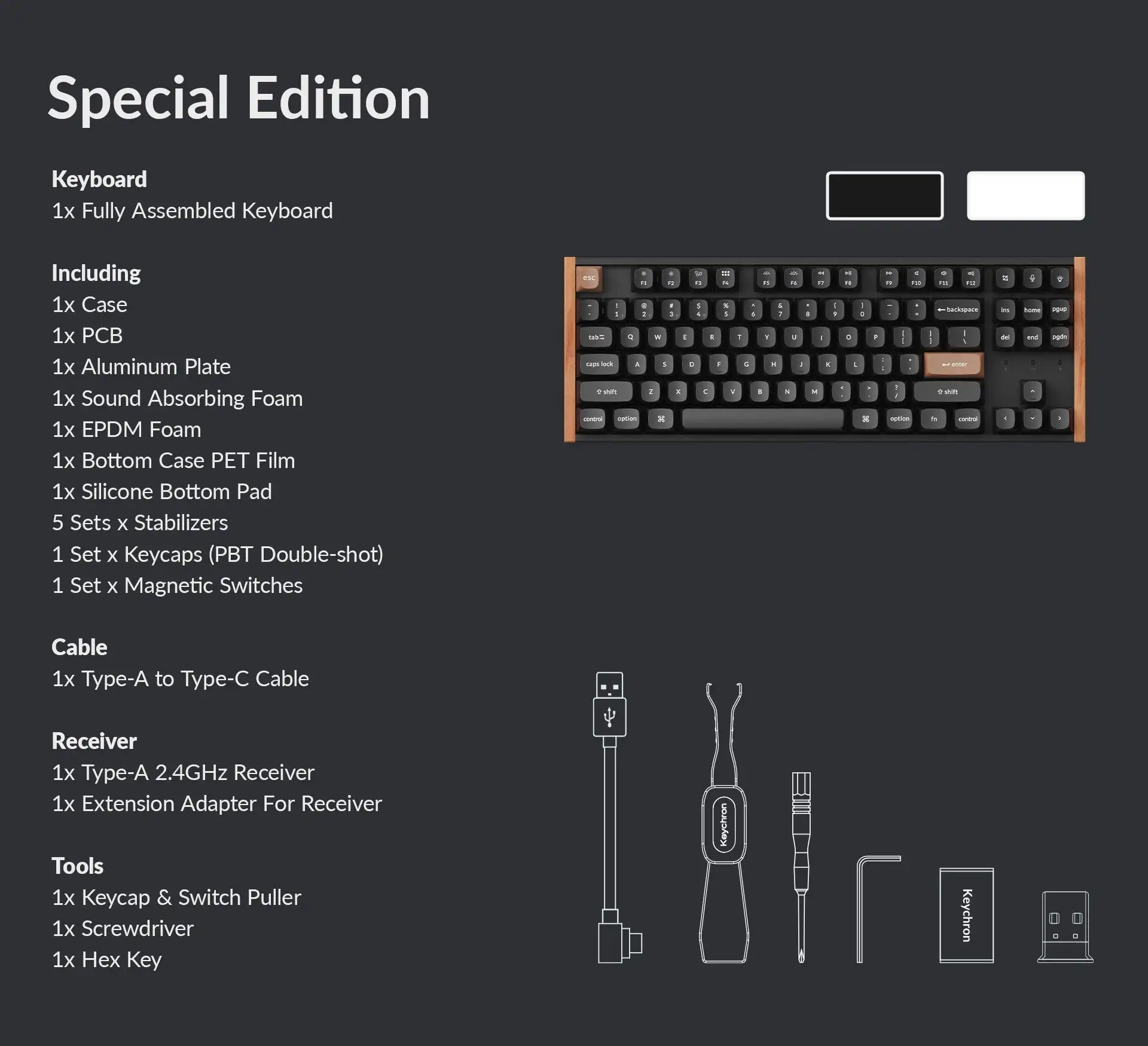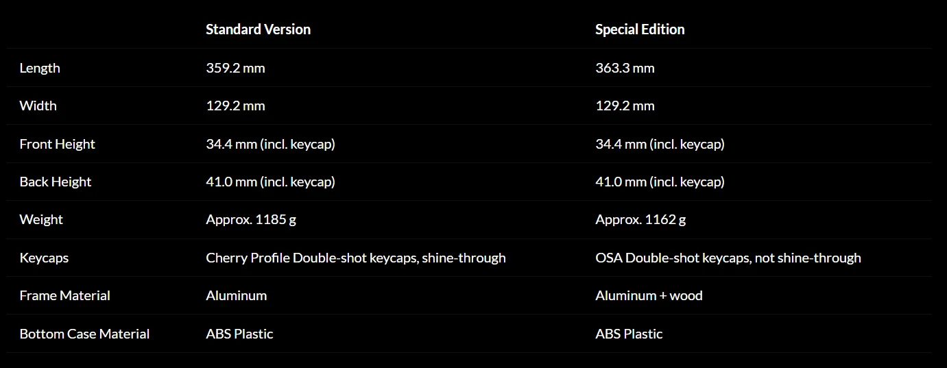 The Special Edition offers two colorways, both with natural rosewood accents—light wood for the white version and dark wood for the black version. Both editions feature OSA profile double-shot PBT keycaps and aluminum with wooden frames.