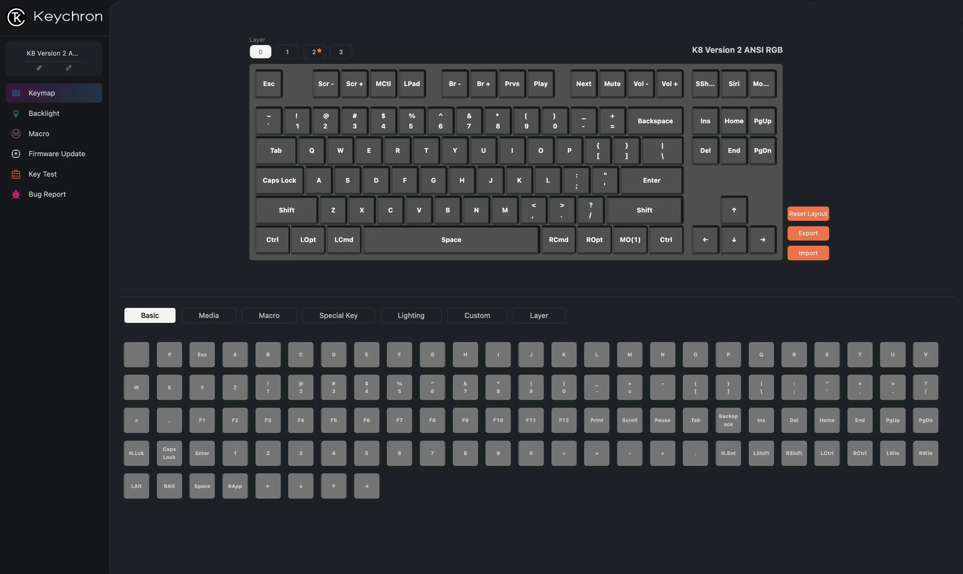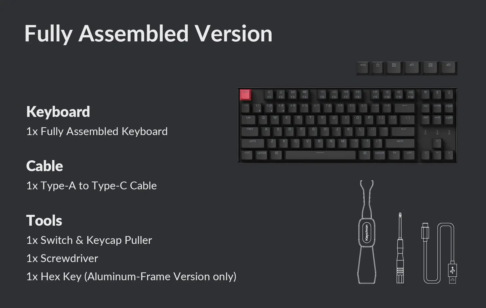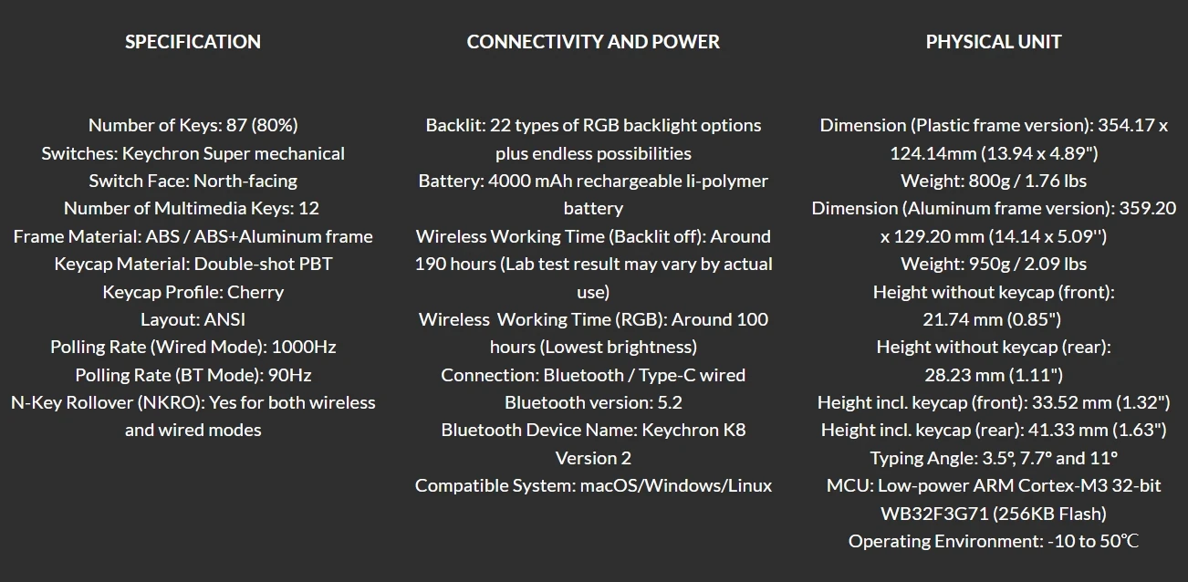 The K8 Version 2 is a wireless mechanical keyboard with a TKL (80%) layout. It supports both Bluetooth 5.2 and wired connections. Configurable through QMK and Keychron Launcher web app, it offers endless possibilities and enhanced productivity in your work and gaming!