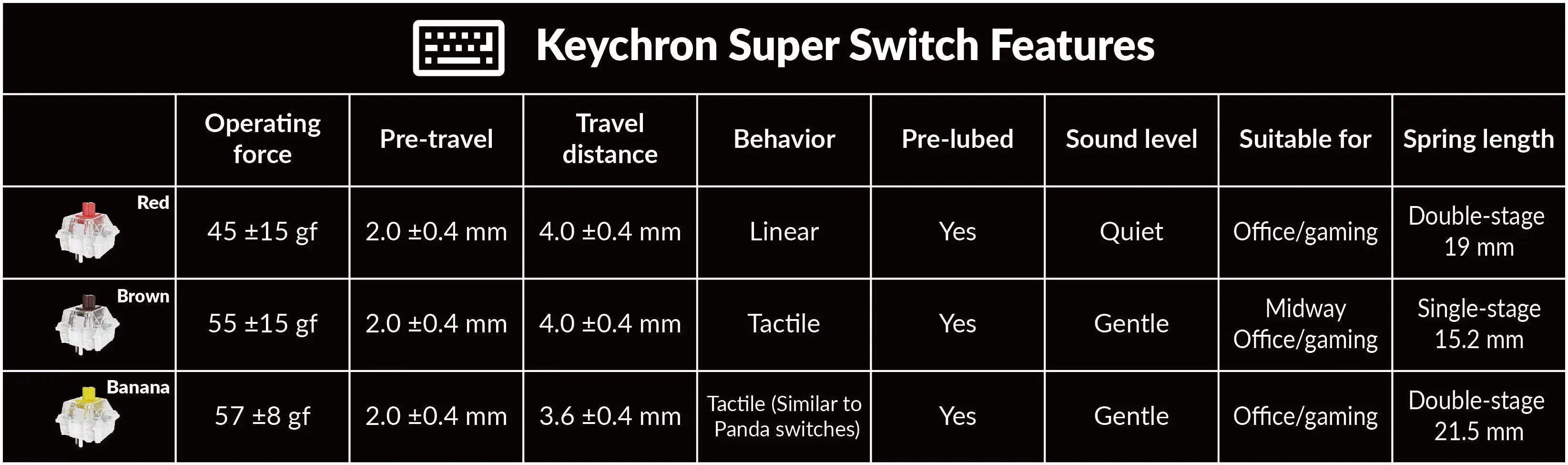 Our exclusive Keychron Super switch adopts a new mold with unparalleled precision. Every switch is tested for pro-grade quality and has a lifespan of up to 50 million clicks, providing great reliability and high performance for long typing sessions. Its new light affection structure on its transparent top housing also ensure high light transmittance and a more consistent, brighter backlight effect.