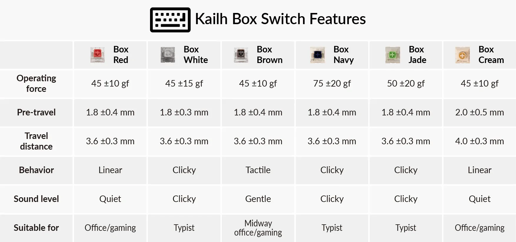 Aside from the Kailh Box regular switches, the Box Jade, Box Navy and Box Cream also join the family. The Box Jade and Box Navy, which requires over 50 gf operating force, brings intense and sturdy typing feel and the Box Cream, with its ultra-smooth travel combined with the box design , makes it a solid choice among linear fans who are looking for a seamless typing experience.