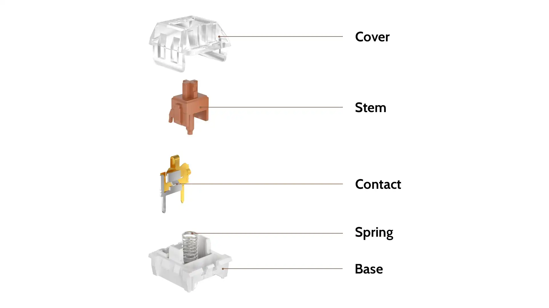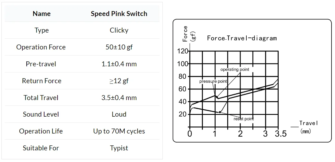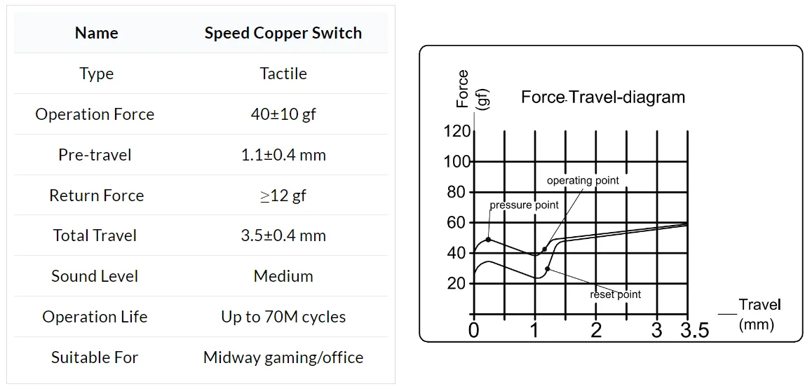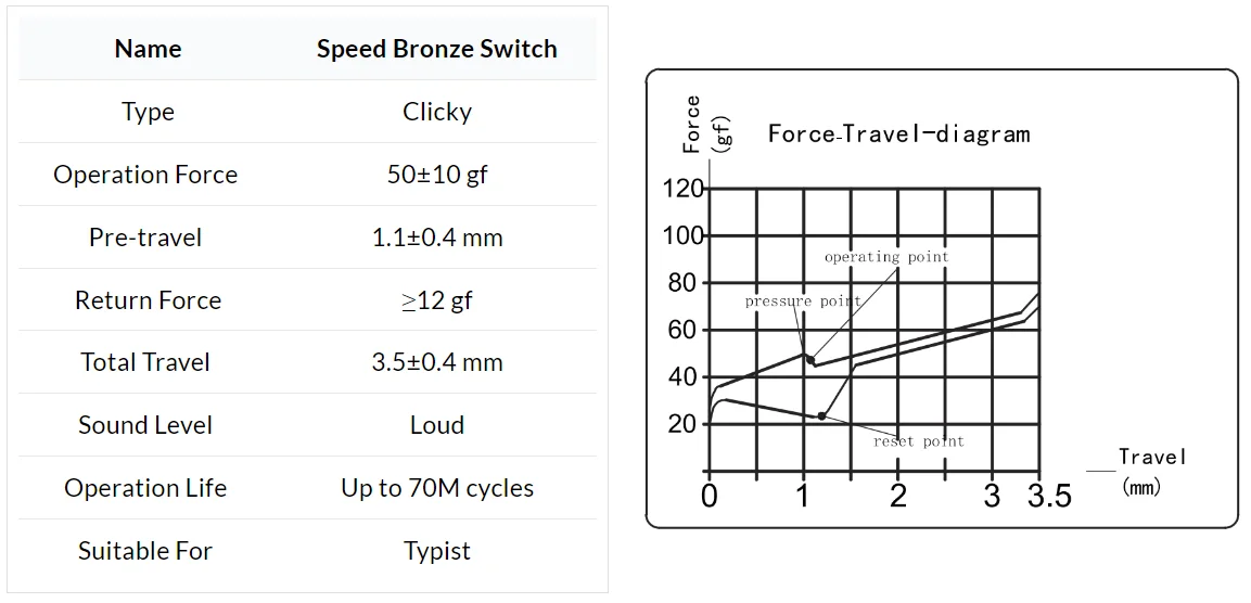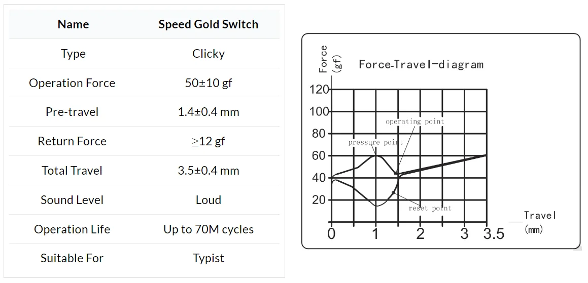 The Kailh speed switches come in 5 colors: silver, copper, bronze, gold, and pink. Also available in your choice of linear, tactile, or clicky switches.