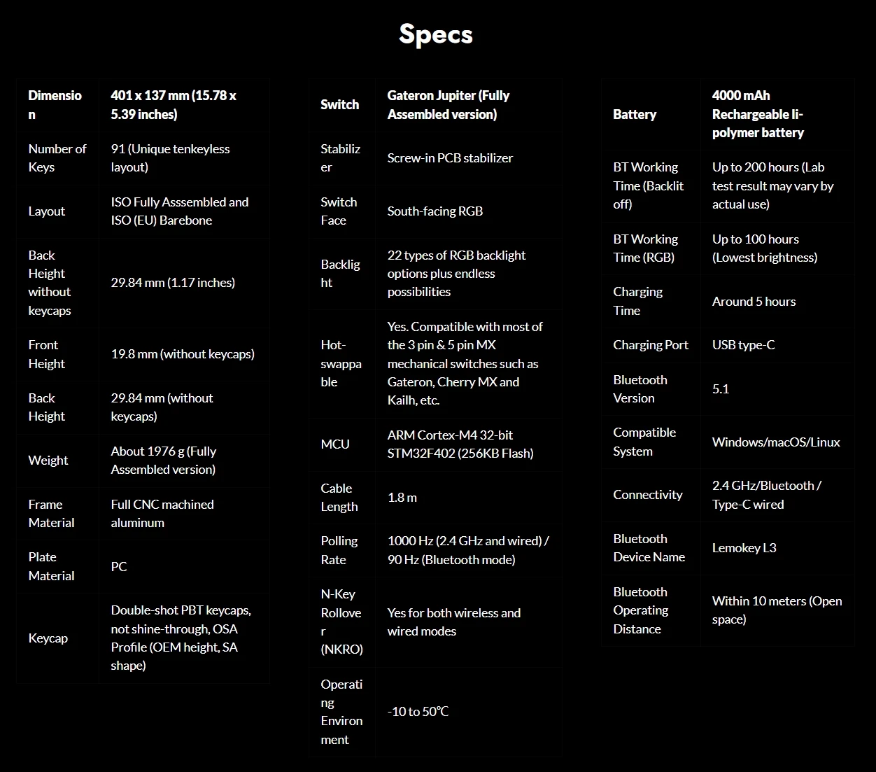 To further leverage your typing experience, the L3 ISO version comes with our unique OSA profile (OEM profile with spherical angle) and non-backlit PBT keycaps that aim to provide a more comfortable fingertip feel, excellent oil resistance, and prevent the legends from fading out.