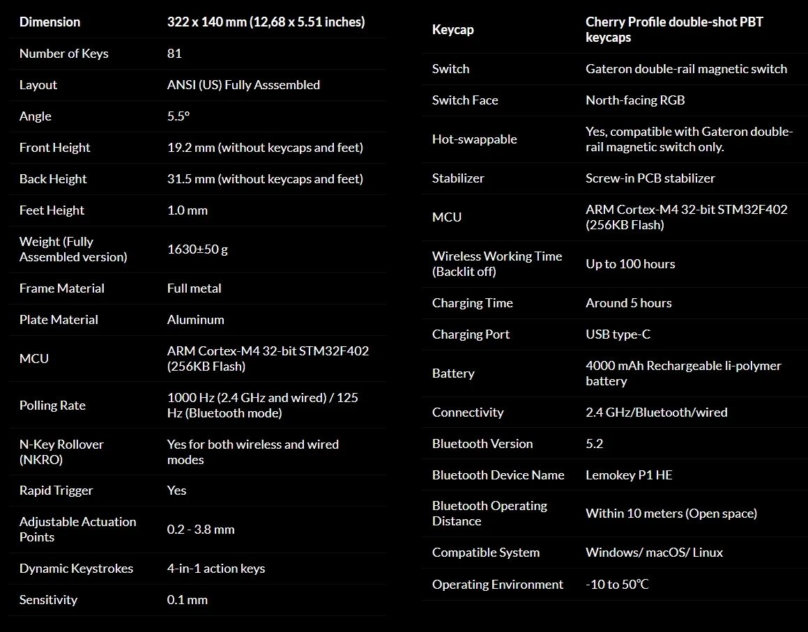 Lemokey P1 HE, a brand of Keychron, introduces a 2.4G connection mode with a superfast 1000Hz polling rate, ensuring a lightning-fast gaming experience. Whether you're a casual gamer or a competitive player, the P1 HE is designed to meet your needs and provide the ultimate comfort and control.
