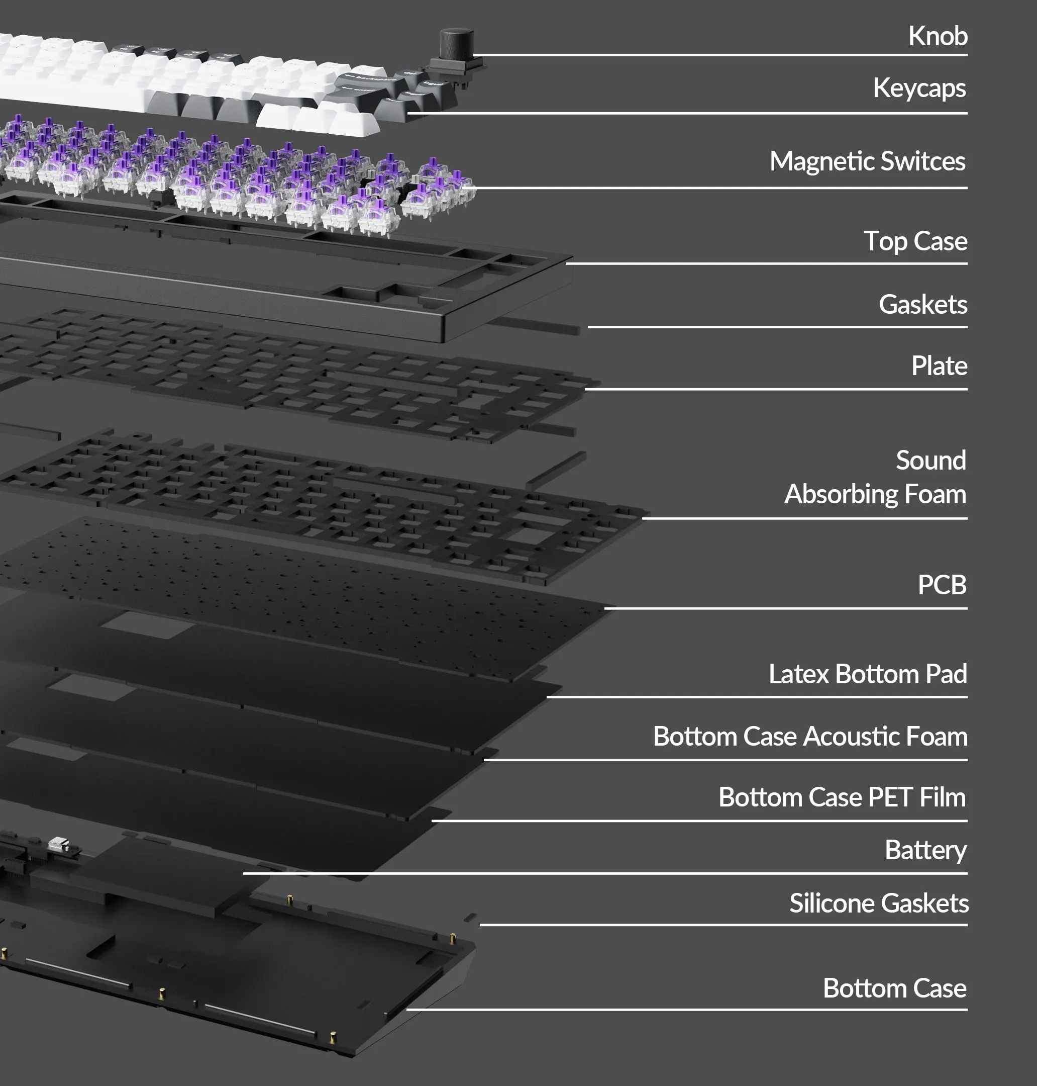 Meet the Q1 HE, the world's first 75% layout wireless QMK custom keyboard equipped with Hall Effect Gateron double-rail magnetic switches. These switches provide a distinct advantage due to their unique mechanism, offering faster feedback, dynamic rapid triggering, and adjustable actuation points, resulting in epic enhancements for the gaming experience tailored to your individual preferences.