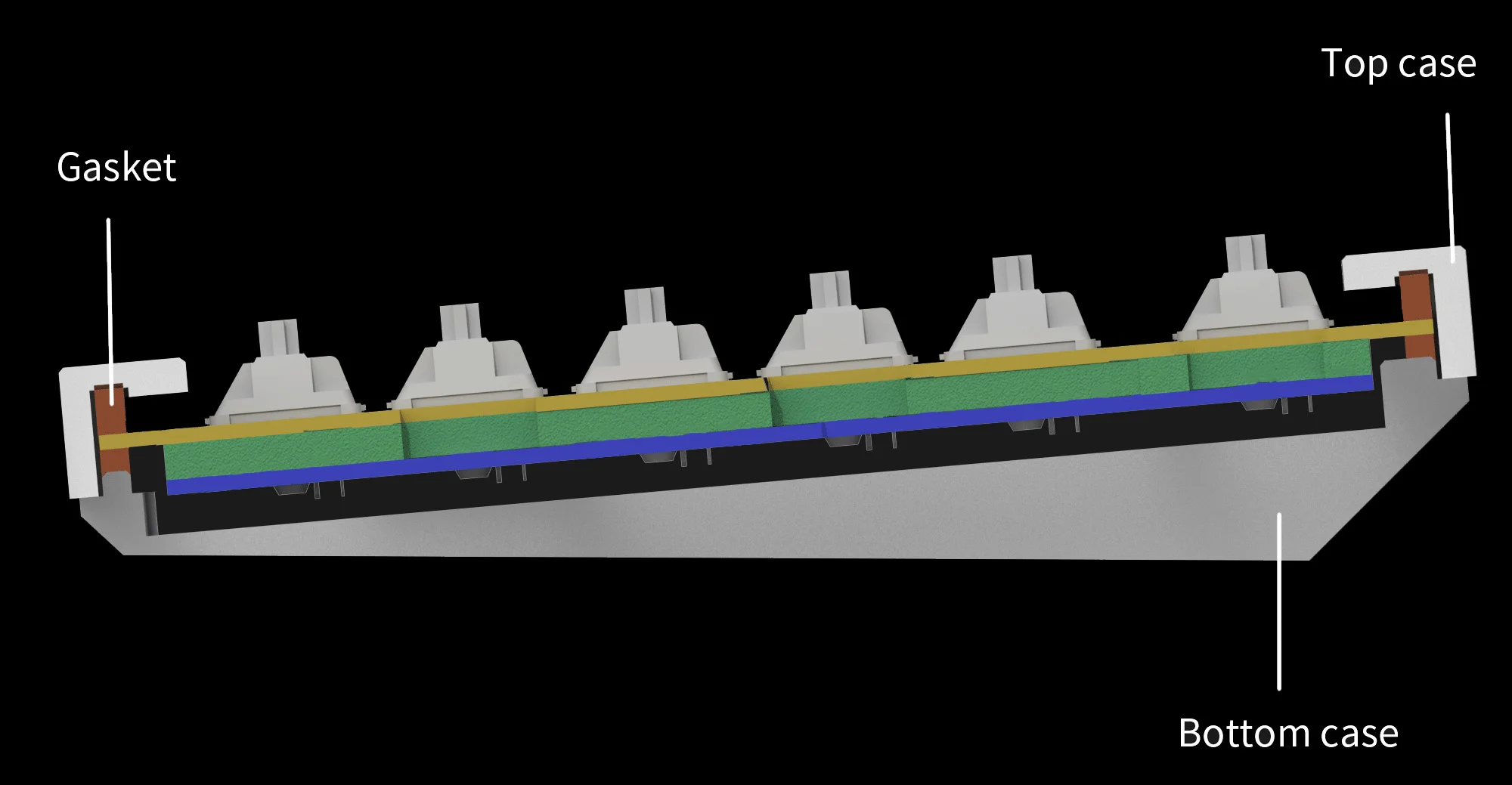 The Double Gasket Design is a new innovative structure in the industry. In addition to the gaskets on the plates, we added silicone pads between the top and bottom cases to significantly reduce the sound resonance between the metals and reduce the noise of the impacted metals. This design allows the keyboard to maintain the flexibility of the gasket structure and improves the overall typing sound.