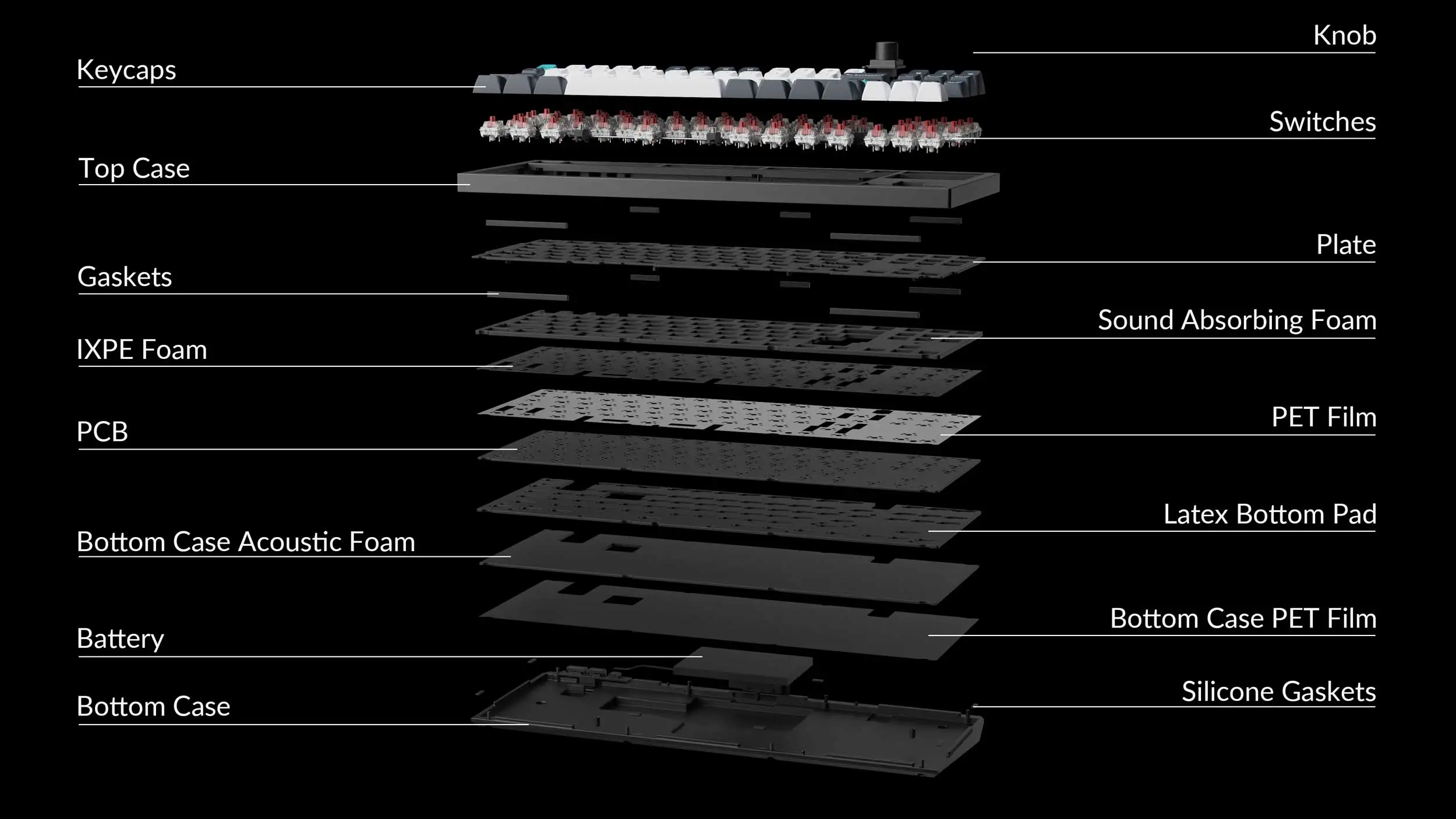 The Double Gasket Design is a new innovative structure in the industry. In addition to the gaskets on the plates, we added silicone pads between the top and bottom cases to significantly reduce the acoustic resonance between the metals and reduce the noise of the impacted metals. This design allows the keyboard to maintain the flexibility of the gasket structure and improves the overall typing sound.