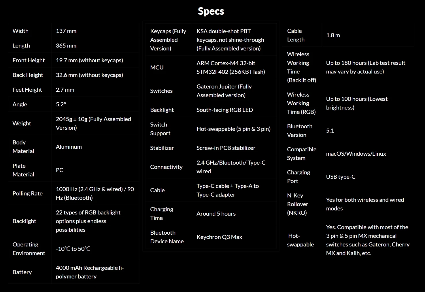 Discover enhanced performance with the Q3 Max Keyboard, featuring a 2.4 GHz wireless connection and a rapid 1000 Hz polling rate for responsive use. It also offers Bluetooth 5.1 connectivity, allowing easy and efficient multitasking by connecting with up to three devices, such as your computer, phone, and tablet, with quick switching capability.