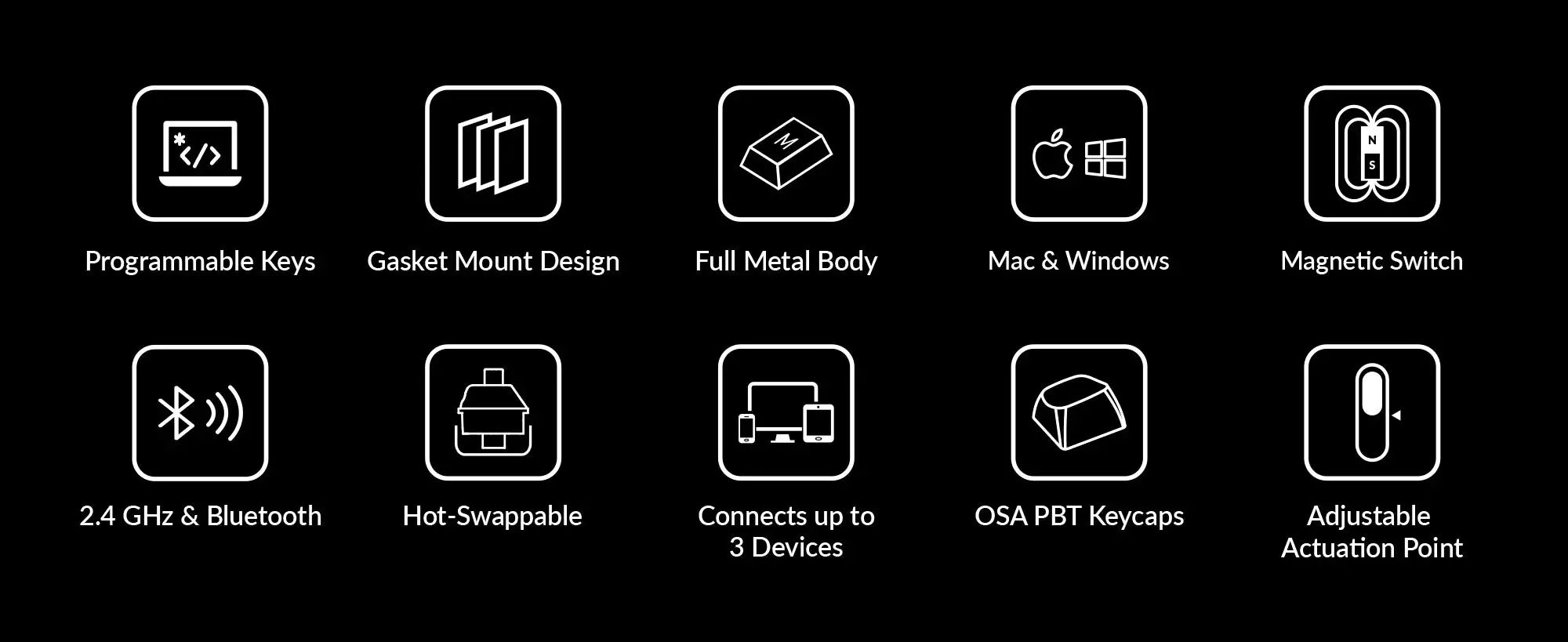 In addition to the Hall Effect magnetic switches, the Q6 HE introduces a 2.4G connection mode with an impressive 1000Hz polling rate, further ensuring a lightning-fast gaming experience. What's more, it also boasts premium features such as Bluetooth connectivity, a double-gasket design, enhanced acoustic foams, an all-aluminum body, PBT keycaps and more.