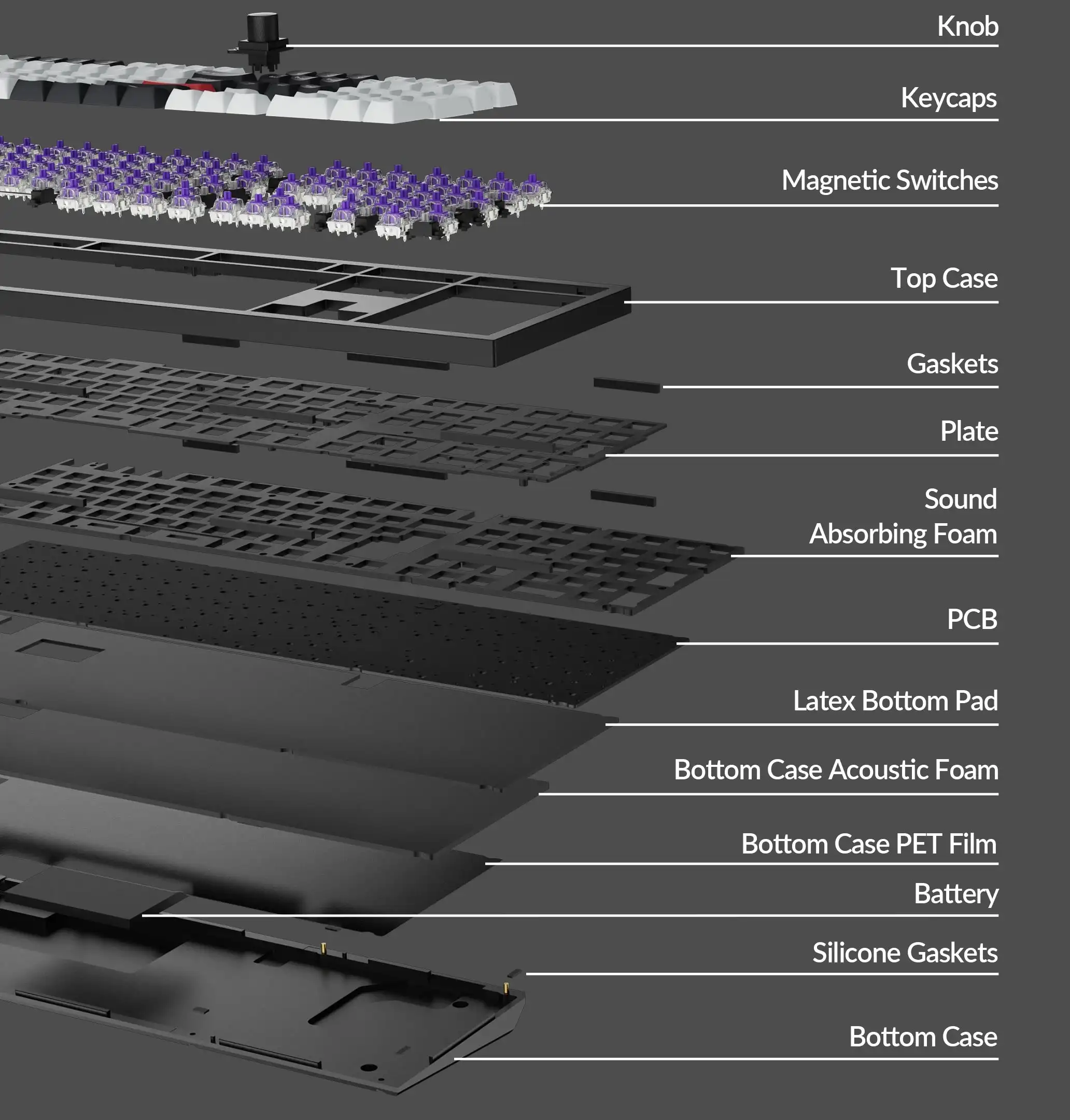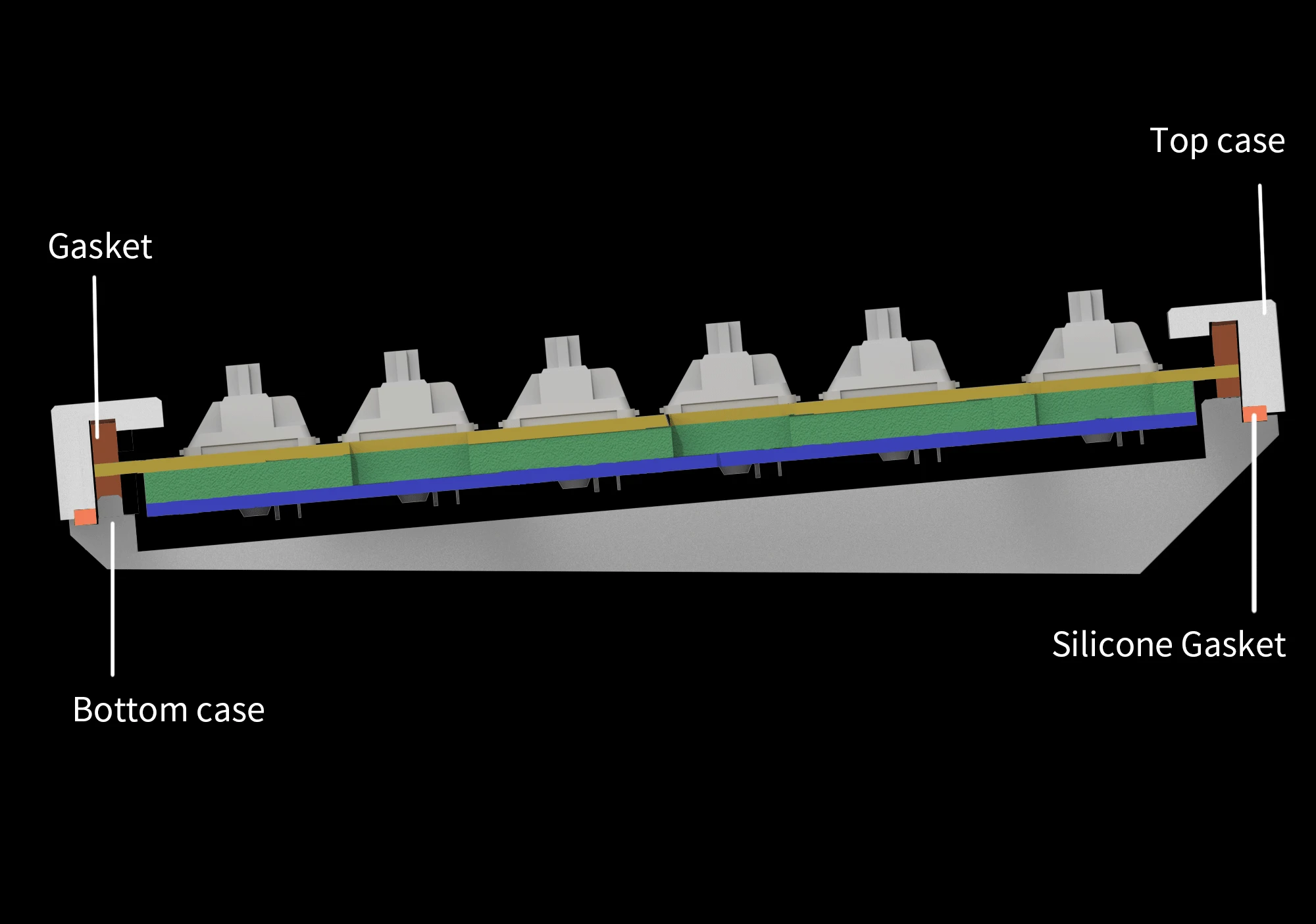 Silicone pads between the top and bottom cases reduce acoustic resonance, maintaining gasket flexibility and enhancing typing sound. The keyboard's bottom features acoustic foam, PET film and Latex, improving sound quality while providing a more comfortable typing experience.