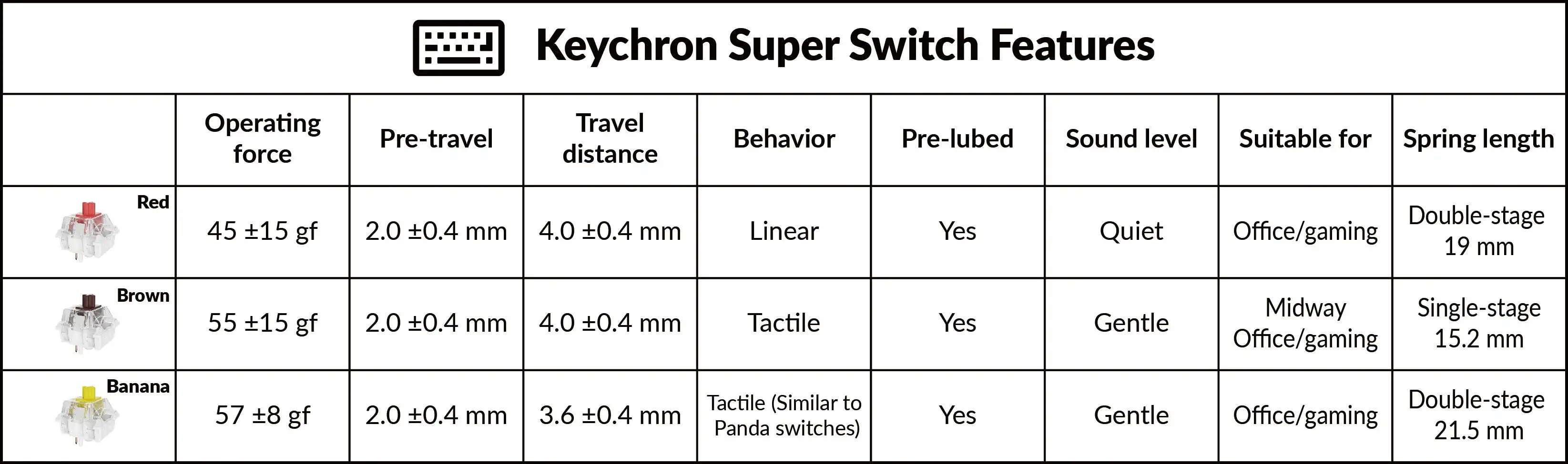 The Keychron Super switches are pre-lubed in the factory to reduce friction and hitches, delivering a smoother typing experience.