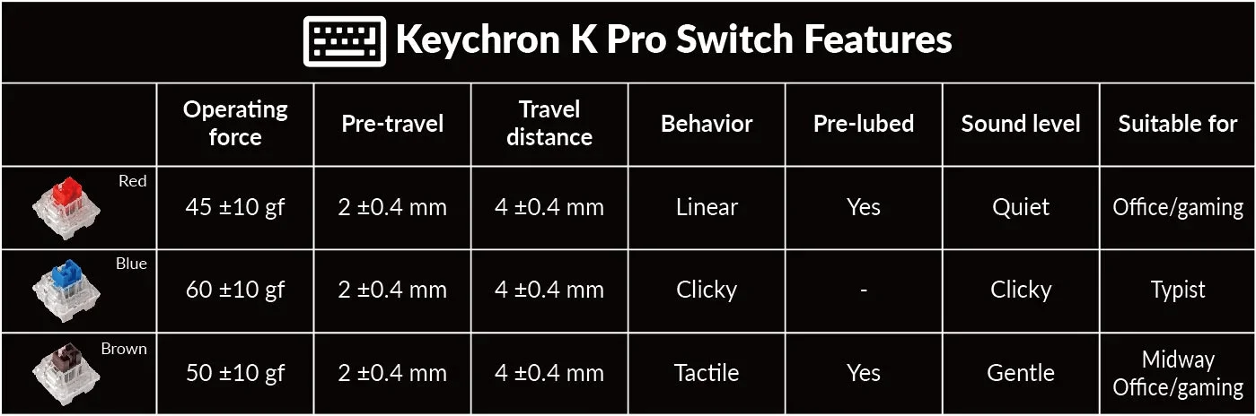 By optimizing the switch mold, the K Pro switch wobbles less than a standard mechanical switch and feels smoother on each hit. Plus, the factory pre-lubed process on all the K Pro switches (exclude the clicky ones), no doubt this will ensure the best smoothness at your fingertips when typing.
